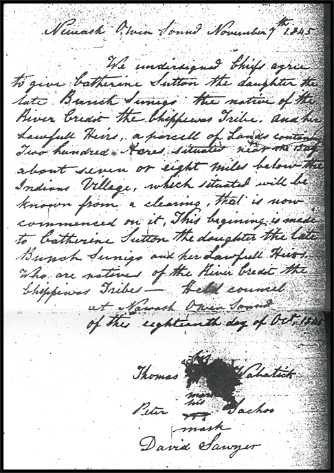Catherine Sutton (née Sonego or Sunegoo) (sometimes spelled Catharine, also known as Nahnee, Nahneebahwequa and Upright Woman), Anishinaabe (Mississauga) writer, Methodist missionary and political advocate (born 1824 in the Credit River flats, Upper Canada; died 26 September 1865 in Sarawak Township, Grey County, Canada West). Catherine Sutton was as an advocate for her people during a time when the cultural, political and economic rights of Indigenous peoples in Canada were formally eroded by assimilationist policies.